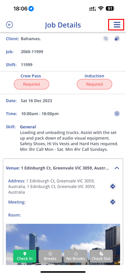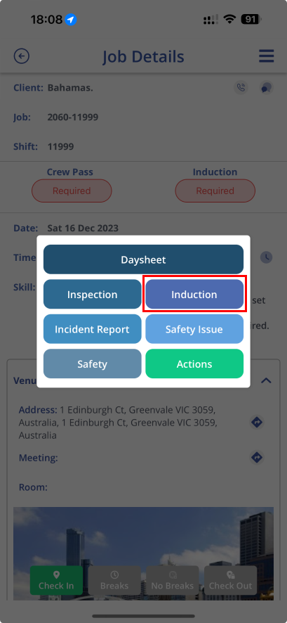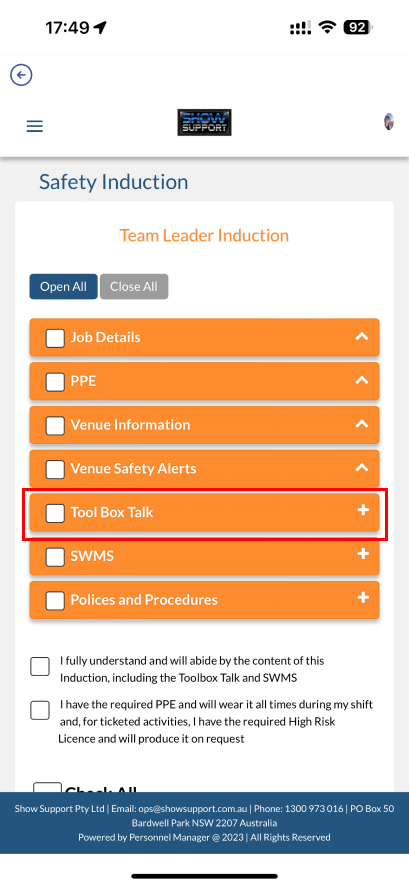 Go to Job Details then click the menu icon top right, open the Induction and select the Toolbox Talk.