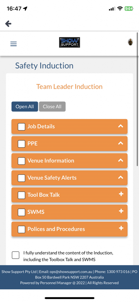 Also, in the CrewCard App you can find the Safe Work Method Statements, Induction materials and venue information. It pays to keep up to date with safety matters.